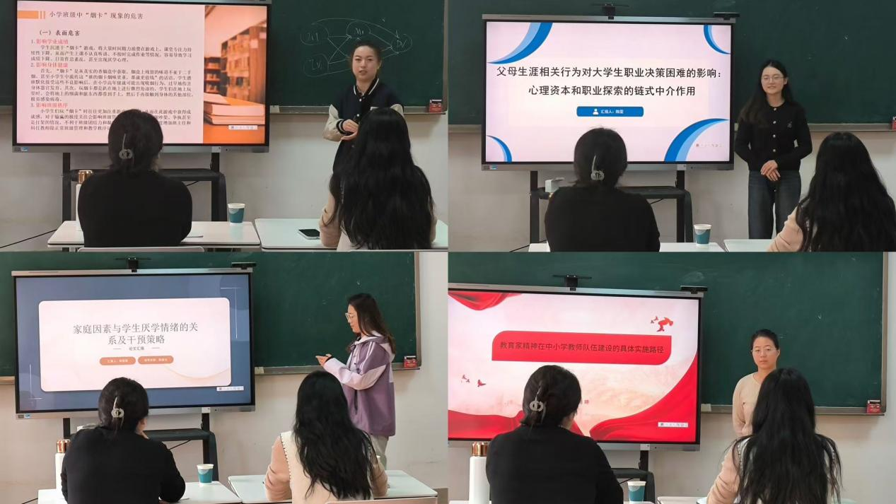 本次论坛由小学教育、心理健康教育、教育管理的四位研究生进行汇报。2024级小学教育研究生吴旭婷以《教育家精神引领下教师队伍建设》为题作了汇报,主要从研究背景和意义、研究方法和思路、研究工具和结果、参考文献四个方面进行汇报。2024级小学教育研究生韩雪慧以《家庭因素与学生厌学情绪的关系及干预策略》为题作了汇报,主要从研究背景、研究方法、研究思路、研究结果、提升路径五个方面进行汇报,并提出自己的观点与看法。2024级心理健康教育研究生陈雯以《父母生涯相关行为对大学生职业决策困难的影响:心理资本和职业探索的链式中介作用》为题作了汇报,主要从研究背景及意义、概念界定及研究现状、研究工具、研究结果、结论、研究不足与创新之处六个方面进行汇报。2024级教育管理研究生张昕宇以《小学班级中“烟卡”现象的思考》为题作了汇报,主要从概念界定、小学班级中“烟卡”现象的基本特征、小学班级中“烟卡”现象的危害、小学班级中“烟卡”现象的成因分析、小学班级中“烟卡”现象的审思、参考文献六个方面进行汇报,并提出了自己的观点与看法。