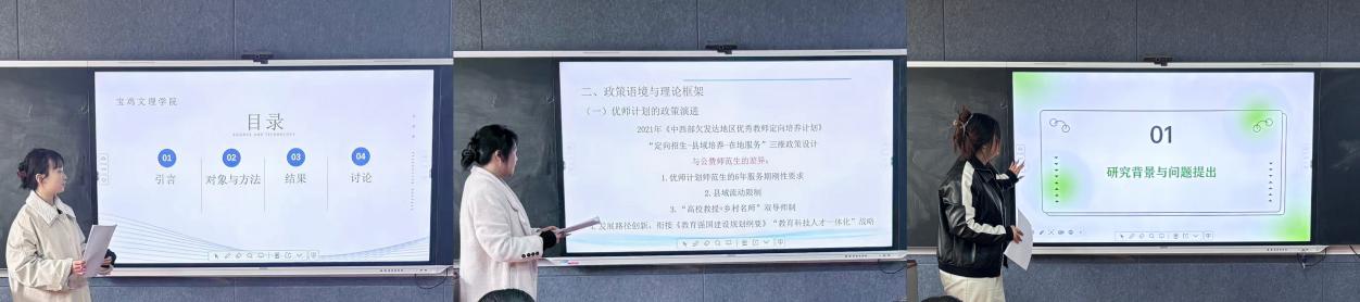 本次论坛由课程与教学论、教育史、教育学原理的三位研究生进行汇报。2024级课程与教学论研究生苏欣瑶以《大学生问题性社交媒体使用与课堂学习有效性的关系:学业倦总的中介作用》为题,从引言、对象与方法、结果与讨论四个方面进行汇报。2024级教育史研究生李沛雨以《新时代乡村教师关怀素养的生成逻辑与培育路径--基于优师计划的价值重构与政策实践》为题,从研究背景、政策语境与理论框架、教师关怀素养价值意蕴的三维解构和教师关怀素养培育策略的系统优化四个方面进行汇报。2024级教育学原理研究生周佳欣以《导生关系”的多维表征、现实困境与改善路径--基于他者伦理学视角》为题,从研究背景与问题提出、多维表征:他者伦理学视域下的批判性审视、改善路径:他者伦理学视角的四维实践指向、结论和参考文献五个方面进行汇报。三位同学的汇报内容丰富,并提出了自己的一些观点与看法。