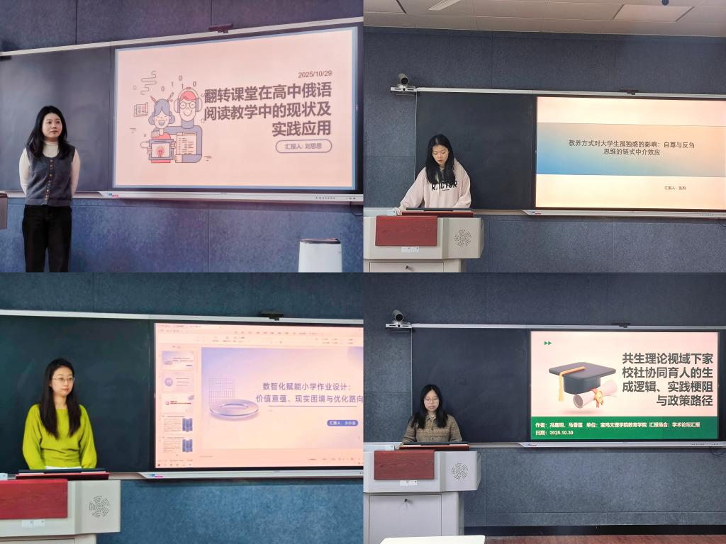 本次论坛由教育管理、心理健康以及小学教育的四位研究生进行汇报。2024级教育管理研究生刘思思以《翻转课堂在俄语阅读教学中的多维剖析与突破路径》为题作了汇报,主要从翻转课堂的内涵、高中俄语阅读教学的特点与现状、翻转课堂在高中阅读教学中的优势与实践应用三个方面进行汇报。2024级心理健康研究生张冉以《教养方式对大学生孤独感的影响:自尊与反刍思维的链式中介效应》为题作了汇报,主要从研究内容、研究方法、研究目的、研究结论、创新点五个方面进行汇报,并提出自己的观点与看法。2024级小学教育研究生齐小童以《数智化赋能小学作业设计:价值意蕴、现实困境与优化路向》为题作了汇报,主要从数智化赋能小学作业设计的价值意蕴、现实困境及优化路向三个方面进行汇报。2024级小学教育研究生冯嘉玥以《共生理论视域下家校社协同育人的生成逻辑、实践梗阻、政策路径》为题作了汇报,主要从研究背景和意义、理论基础、生成逻辑、实践梗阻、政策路径五个方面进行汇报。