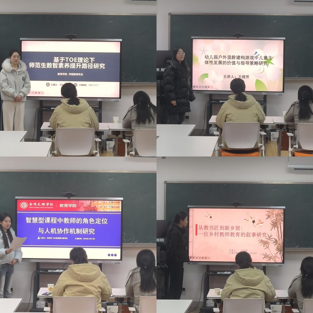 本次论坛由教育学原理、学前教育以及课程与教学论的四位研究生进行汇报。2024级学前教育研究生周亚茹以《TOE理论下的师范生数智素养提升路径研究》为题作了汇报,主要从研究背景和意义、研究方法和思路、研究工具和结果、参考文献四个方面进行汇报。2024级学前教育研究生王晓芳以《幼儿园户外混龄建构游戏中儿童主体性发展的价值与指导策略研究》为题作了汇报,主要从研究背景、研究方法、研究思路、研究结果、提升路径五个方面进行汇报,并出自己的观点与看法。2025级课程与教学论研究生朱林林以《智慧型课程中教师的角色定位与人机协同机制研究》为题作了汇报,主要从研究背景和意义、研究方法和思路、研究工具和结果、参考文献四个方面进行汇报。2025级教育学原理研究生冯卓骐以《从教书匠到新乡贤 一位乡村教师的叙事研究》为题作了汇报,主要从研究背景和意义、研究方法和思路、研究工具和结果、参考文献四个方面进行汇报。